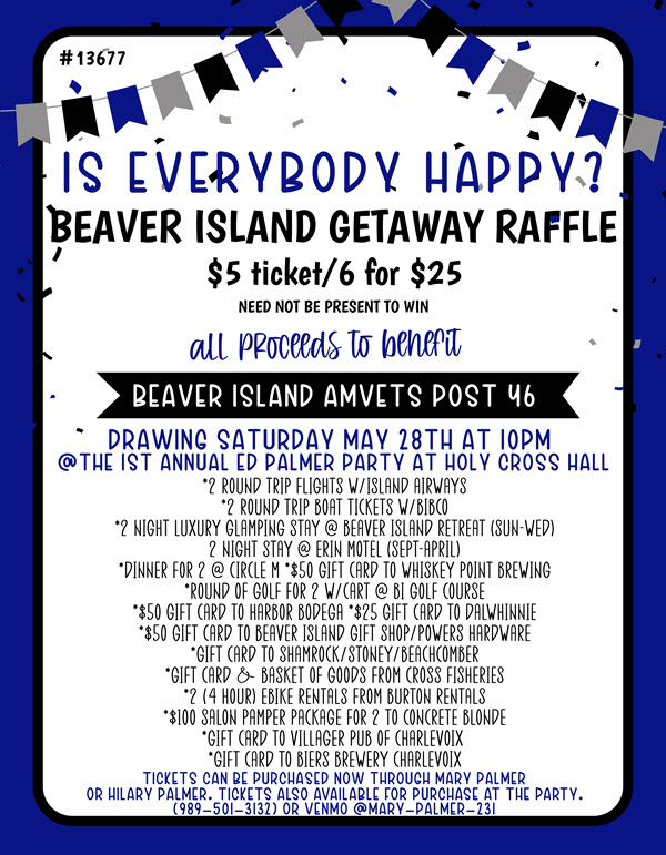 Join us as we reunite with old traditions & each other, while tucked into Paradise Bay for an evening of song & dance. We hope to make this an annual event for many years to come. This year’s party will benefit the AMVETS Post 46 & we have an awesome raffle package that you can buy tickets on. The winner receives everything listed (see the image below), plus a few other surprises. If you cannot make the party (YOU DO NOT NEED TO BE PRESENT TO WIN), you can purchase tickets from Mary Palmer (989-501-3132) via cash, check, Venmo (Mary-Palmer-231) or Facebook pay. You can buy tickets at the door for other smaller raffle prizes and the 50/50. Michiagn License Number 13677.